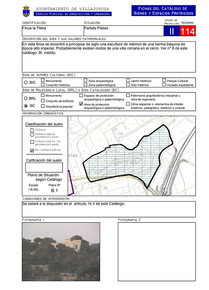 El Grupo Vecinal Villajoyosa, denuncia que "La Finca de La Pileta" ahora est en manos de un fondo buitre sin que los polticos hayan hecho nada durante dcadas para garantizar la adquisicin de un monumento de un valor incalculable. Se anunci en el pleno de agosto que se ha vaciado todo su interior por la nueva propiedad llevndoselo en camiones. Es un Espacio y Bien Protegido de importantsima relevancia para el patrimonio cultural de los vileros, ubicada en la partida Piletes, tiene un grado 11 de proteccin como Monumento Bien Catalogado situada sobre un rea de proteccin arqueolgica o paleontolgica en suelo no urbanizable en la que se encontr a principios de siglo una escultura de mrmol de una herma bquica de poca alto imperial, probablemente existen restos de una villa romana en el cerro segn se confirma en la ficha del catlogo de bienes y espacios protegidos del Ayuntamiento de Villajoyosa del Servicio Municipal de Arquitectura y Urbanismo.