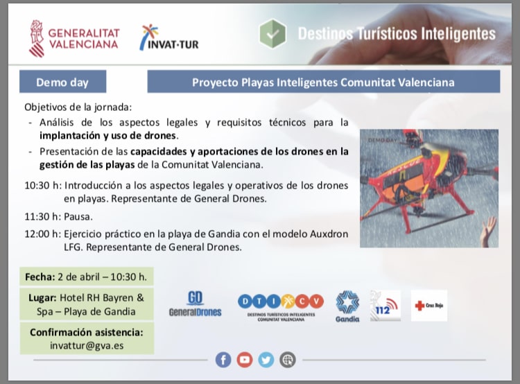 Grupo Vecinal Villajoyosa solicita al Ayuntamiento de Villajoyosa que acuda a la jornada programada por la Generalidad Valenciana sobre playas inteligentes para la implantacin y uso del DRON, ser el prximo 2 de Abril en Ganda, organiza el INVAT-TUR