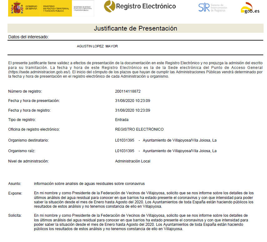 El pasado 31 de agosto del 2020, desde el movimiento activista vecinal en Villajoyosa se formul la peticin de informacin para conocer el informe de resultados de anlisis de covid-19 en aguas residuales de la localidad desde enero del 2020 para poder as conocer la situacin por barrios y poder as tomar decisiones basadas en datos reales para combatir el COVID, igual que se estaba haciendo en muchos otros municipios de toda Espaa. La solicitud motiv que el Ayuntamiento y la empresa privada que tiene la concesin de nuestras de gestin de nuestras aguas a marchas forzadas instalaran un sistema que ahora, 8 meses despus de la peticin y a falta de un mes, segn el Presidente del Gobierno de Espaa, para terminar el estado de alarma, nos sorprendan con un anuncio que llega tarde, aunque ms vale tarde que nunca.