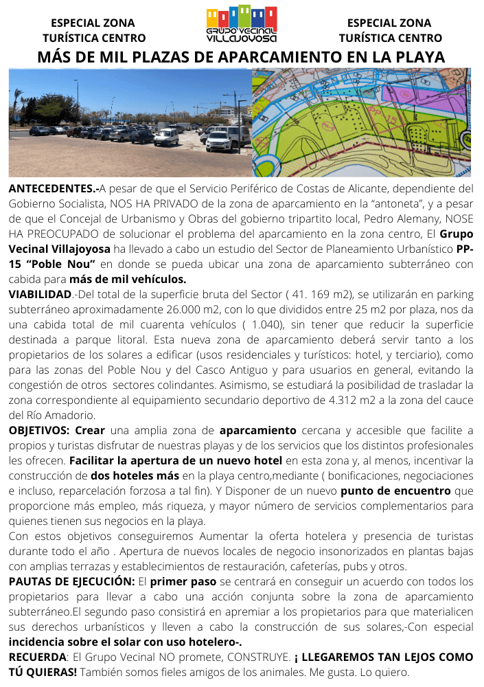 El Grupo Vecinal Villajoyosa ha llevado a cabo un estudio del Sector de Planeamiento Urbanstico PP-15 ?Poble Nou? en donde se pueda ubicar una zona de aparcamiento subterrneo con cabida para ms de mil vehculos.