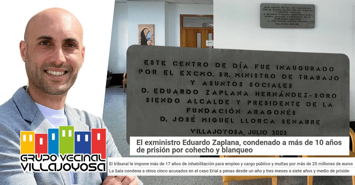 El Grupo Vecinal Villajoyosa solicita retirar la placa conmemorativa del Centro de Da de la Fundacin Aragons de la que el alcalde del Ayuntamiento de La Vila es Presidente tras hacerse pblica la sentencia de la Audiencia Provincial de Valncia que ha condenado a 10 aos y cinco meses de prisin al exministro de trabajo y asuntos sociales del PP y expresidente de la Generalitat Valenciana, Eduardo Zaplana, como autor de los delitos de prevaricacin, cohecho, falsedad y blanqueo de capitales.